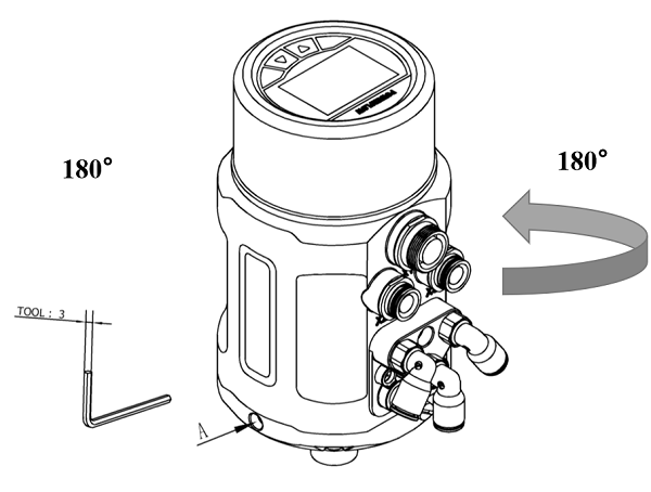 將定位器與閥門連接之后,定位器可與閥門之間做角度調(diào)整。若需要調(diào)整定位器操作界面角度,松開A處的內(nèi)六角緊定螺釘后,順時針或逆時針180°范圍內(nèi)調(diào)整到需要的角度,再擰緊緊定螺釘。